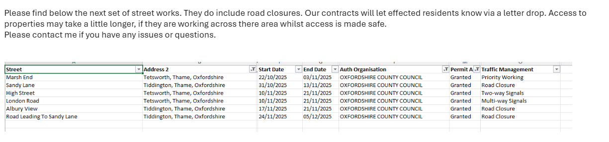 Gigaclear update notification of future works starting 10th November on High Street and London Road. Affected residents to be notified by letter drop as includes road closures and access to properties.